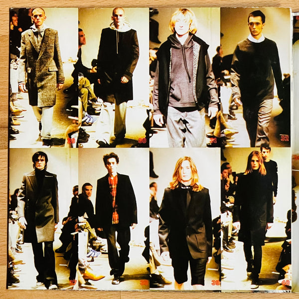 Early Raf Simons fold-out poster look book for the Autumn/Winter 1997 collection. Presented in a mini record sleeve housing the poster.